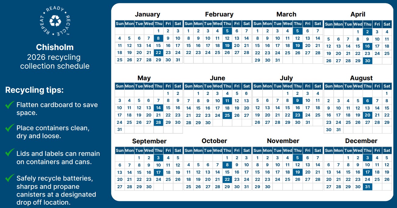 At the end of March 2025, Carts will be delivered to the residents of Chisholm to be used as their sole recycling receptical to be placed at the curb on the scheduled pick-up day.