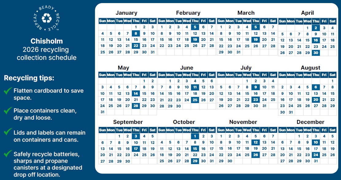 At the end of March 2025, Carts will be delivered to the residents of Chisholm to be used as their sole recycling receptical to be placed at the curb on the scheduled pick-up day.